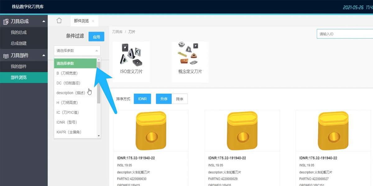 You can select inserts from your own parts library online, and the system automatically matches the optional tool holder bythe ISO13399 standard interface code.