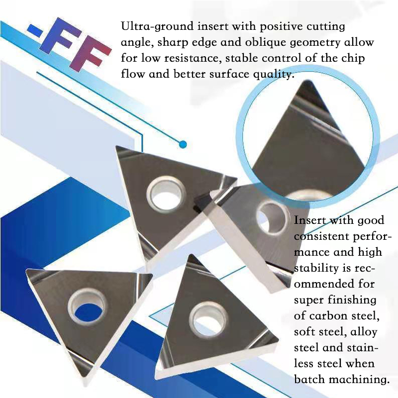 Insert with good consistent performance and high stability is recommended for super finishing of carbon steel, soft steel, alloy steel and stainless steel when batch machining.
