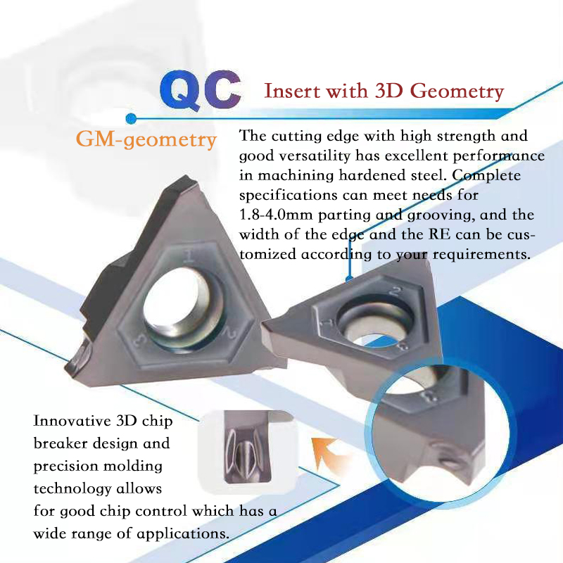 Insert adopts positive cutting angle with sharp edge structure, the mirror effect of the rake side of the insert, and the curved cutting edge for finely control of the chip flow.