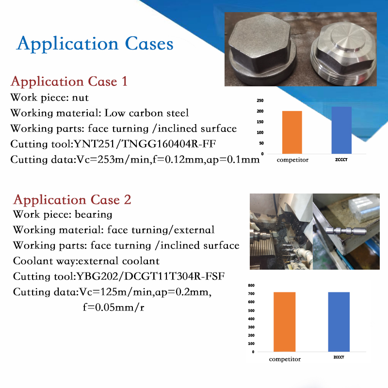 The special surface treatment of the insert lead to the reduction of the chip stickness to the rake side of the insert, resulting in excellent chip breaking performance.