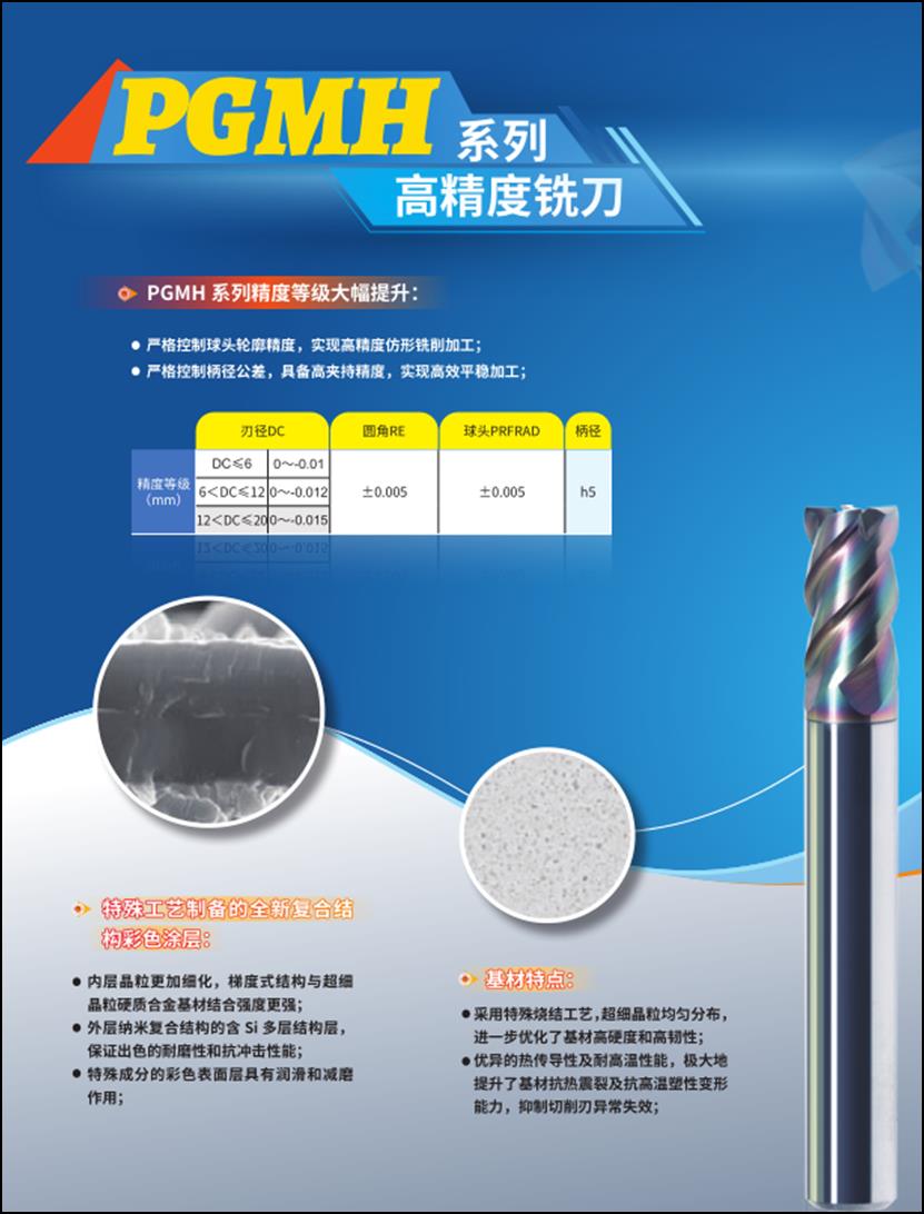 適合高硬度高精度加工的PGMH整體硬質(zhì)合金銑刀:PGMH系列采用特殊燒結(jié)工藝,超細(xì)晶?;?,具有更好的熱傳導(dǎo)性和耐高溫性能,在高速高效加工過(guò)程中具備更好的抗熱震裂及抗高溫塑性變形性能;采用全新復(fù)合結(jié)構(gòu)彩色涂層,內(nèi)層的晶粒更細(xì),梯度式結(jié)構(gòu)與超細(xì)晶粒硬質(zhì)合金基體的結(jié)合強(qiáng)度高;外層采用納米復(fù)合結(jié)構(gòu)多層結(jié)構(gòu),保證了出色的耐磨性和抗沖擊性能;特殊彩色表面層,具有更好的潤(rùn)滑和減磨作用,辨識(shí)度高;在結(jié)構(gòu)方面采用大芯厚高剛性設(shè)計(jì),保證在大參數(shù)切削環(huán)境下加工過(guò)程的平穩(wěn)。